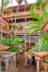 Es sind nicht nur die besonderen Fußböden aus großen Teakholzdielen, die herrlichen Kassettendecken der großen Säle oder die kuriose Wendeltreppe mit Gitterwerk, die in den ersten Stock führt, die auffallen. Doch die Holzarbeiten erreichen auf dem Außenbalkon und in den verschiedenen Galerien und Balustraden des Innenhofs ein herausragendes Niveau, nicht zu vergessen die beeindruckende Eingangstür an der einzigen Fassade.