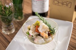 Una vez dentro, aunque pequeño y recoleto, uno siente disponer del espacio necesario, sin agobios. Dentro se hace más grande. En mi última visita, a la par que nos servían un excelente vino tinto, nos ofrecían a modo de agasajo de la casa, lo que unos describimos como un sofisticado salpicón de pulpo y otros como un ceviche de pulpo, fuere como fuere, excepcional.