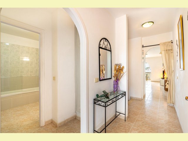 A spacious (102.72m2) two-bedroom, two-bathroom, duplex apartment located in a quiet residential gated community at the end of a cul-de-sac, nestled between a natural valley (ravine) and a banana plantation. Briefly comprising: On the top floor an entrance leading to a reception hall with storage, an archway leads to a double bedroom with fitted wardrobes and access to a private terrace. A full bathroom with shower over the bath. A fitted kitchen with integrated appliances, a utility room equipped with an auto washing machine, a spacious lounge with a covered terrace with sea and mountain views that doubles as a dining area. A staircase leads down to the lower floor where you will find a modern fully tiled shower room with a 'walk-in' shower. A dressing area with ample fitted wardrobes leading to a further double bedroom. From this bedroom is access to a spacious terrace with excellent sea and mountain views. Included in the asking price are the furnishings, a private parking space and a storeroom in the secure underground car park.