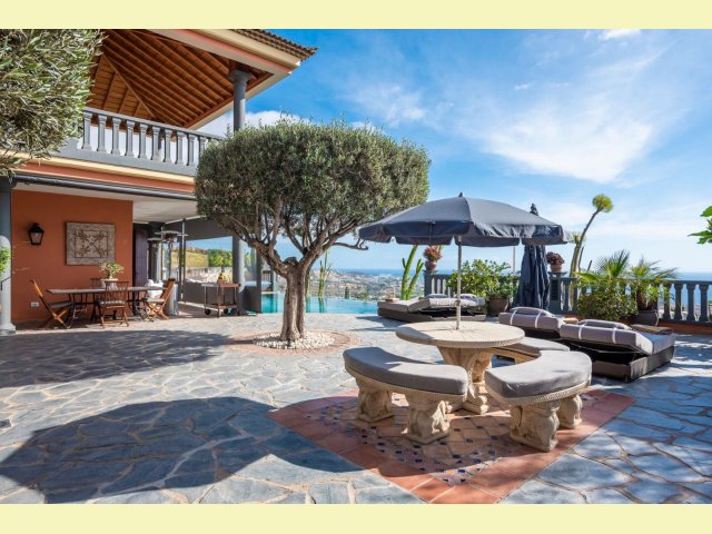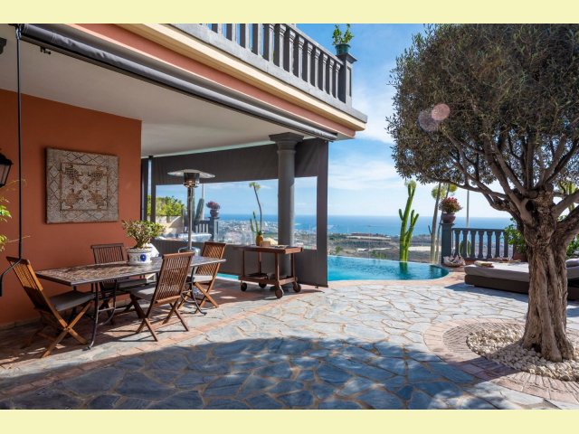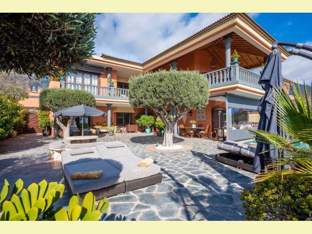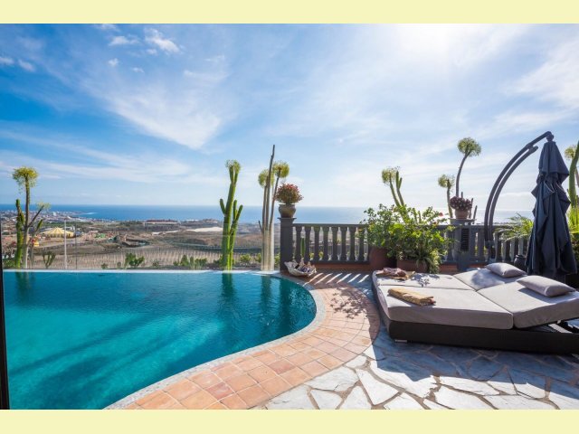 Morfitt Properties Tenerife are pleased to offer for sale this luxury rustic style villa in the area of Adeje. The property offers commanding views over the coast line and out to sea. Built on a plot of 606m2 with a total construction of 377m2 this property offers a large garage for several cars and a basement with bodega, 2 storage rooms, and a bedroom and bathroom. On the main living area there is a fully fitted and equipped kitchen and lounge with to the swimming pool and sea ! On the same level there is also a guest bedroom and bathroom. On the upper level there are 2 double bedrooms both with en-suite bathrooms and access to a terrace with more great views. The private swimming pool is heated and the exterior offers great space to enjoy the long sunny days and spectacular sun sets. This property is a must see and is sold fully furnished.